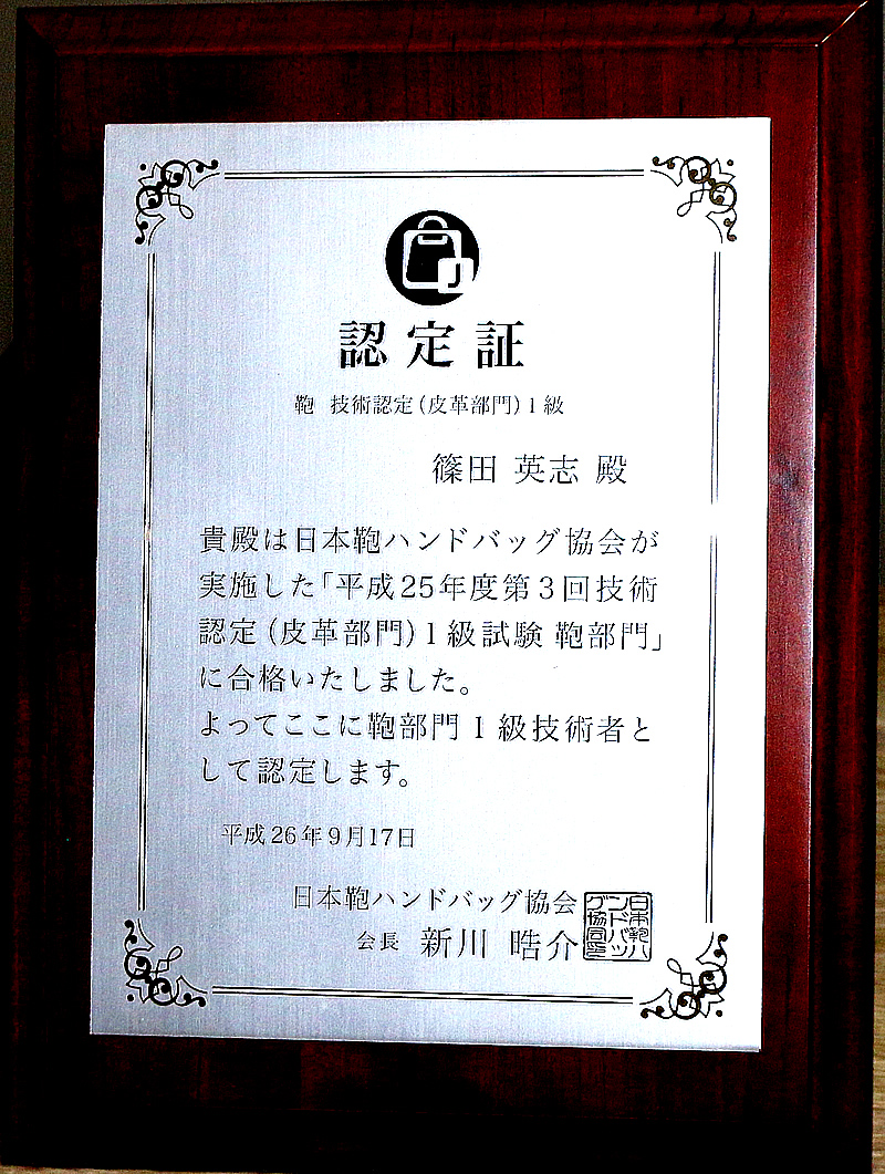 ・平成26年度:篠田英志が鞄 技術認定(皮革部門)1級 認定(日本鞄ハンドバッグ協会)